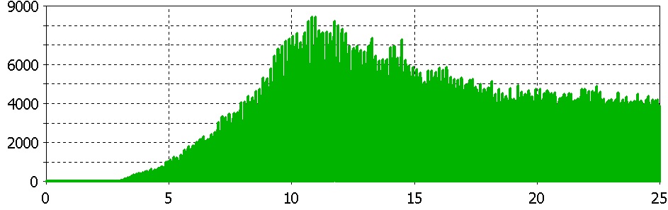 A DC voltage signal of 15kV is applied between the anode and cathode near the input. A DC magnetic field of 0.765 Tesla was taken to achieve the synchronism between electron drift velocity and phase velocity of the RF wave. PIC simulation predicted the RF power of 21 kW, which can be seen in Figure 3. Figure 4 shows the Fourier transform of the developed amplitude signal, confirming the power at 77 GHz.