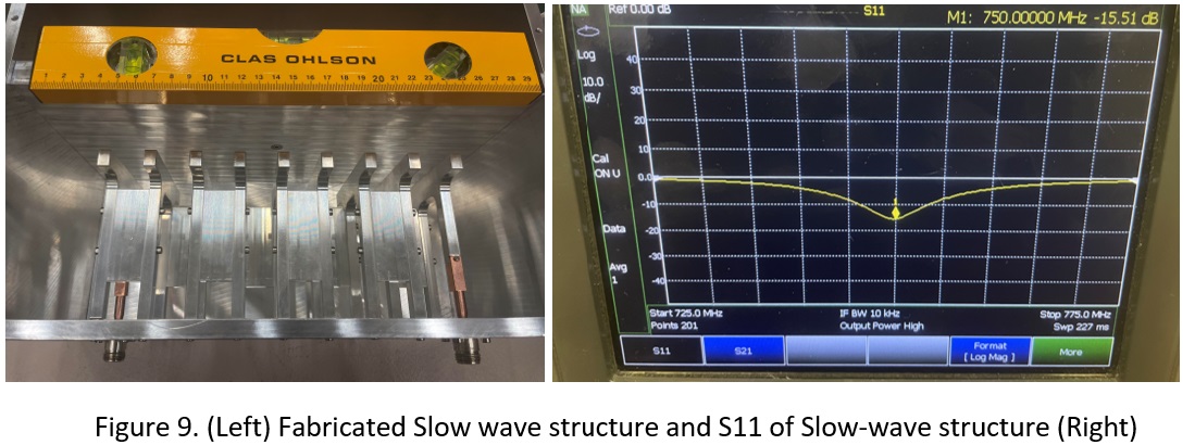 We are also working on a novel megawatt-class 750 MHz Cross-Field Amplifier that has improved performance metrics such as gain, efficiency, phase stability, and longevity. The development of the megawatt-class 750 MHz Cross-Field Amplifier involved comprehensive eigenmode simulations, particle-in-cell simulations, fabrication and experimental validation. Figure 9 (Left) shows the fabricated slow-wave structure, designed after optimising geometric parameters to support operation at 750 MHz. The performance of the structure was verified through S-parameter measurements, with S11 data shown in Figure 9 (Right). The result reveals a minimum reflection at 750 MHz with -15.51 dB, confirming proper impedance matching and successful frequency tuning. This low reflection signifies minimal power loss and validates the accuracy of the simulation-guided design.