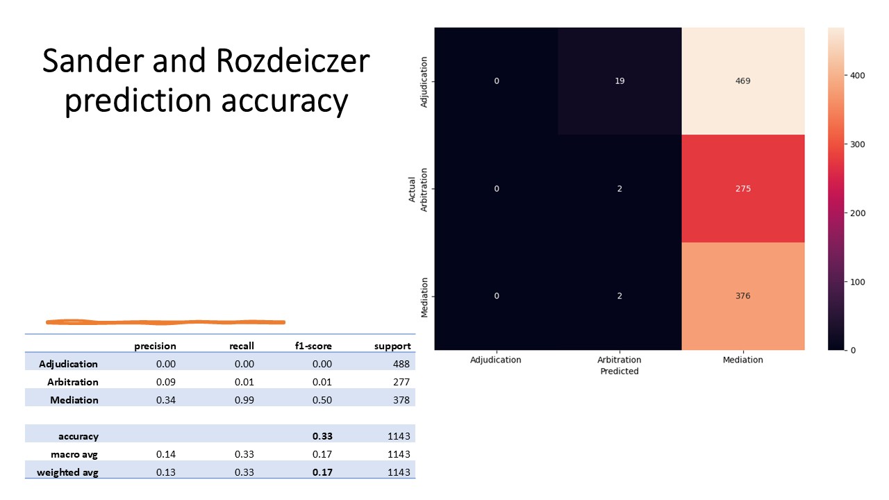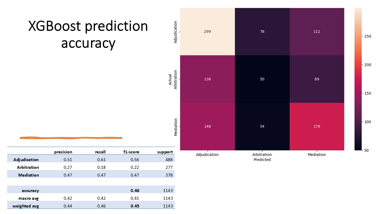 Our experiment proved less successful in terms of predicting the choice of future litigants. Our results reflect the performance of three advanced prediction algorithms. Despite the sophistication of these algorithms, the maximum accuracy achieved was 55%, a significant improvement over random guessing but potentially insufficient for a commercial product. Since the models’ accuracy is not sufficient for commercial use, it made us rethink the next steps of our endeavour. Considering the significant developments in the realm of GenAI, we plan to develop a persuasion bott based on conflict resolution foundations in order to help possible litigants to realise the advantages of mediation.