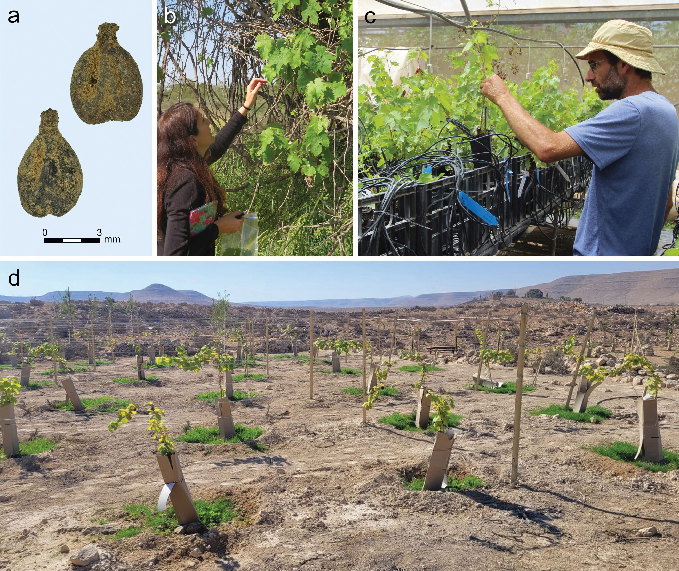 The two grape varieties were also sent for paleogenetic sequencing and identification at the Ancient DNA lab in the Steinhardt Museum of Natural History at Tel-Aviv University. We compared the genetic makeup of the feral grape samples with the genetic readings of modern grapevines available from open-access genetic libraries, as well as with genomic data obtained in a separate study of ancient grape pips that were retrieved from Avdat, a Byzantine era Negev viticultural hub. The feral grapes were identified as endemic varieties – the “Syriki” and the “Be’er” (Hebrew for “water well”) – and found to possess a second degree of genetic kinship to the Avdat grape pips. In September 2023, in cooperation with the Negev regional municipalities and the Israel Nature and Parks Authority, 85 cloned cultivars were planted in an experimental vineyard situated at the base of the Avdat tourism park. The vineyard is being tended with modern agricultural techniques and we are tracking the responses of the grapevines to the arid environment and the ongoing progress of their revival.
