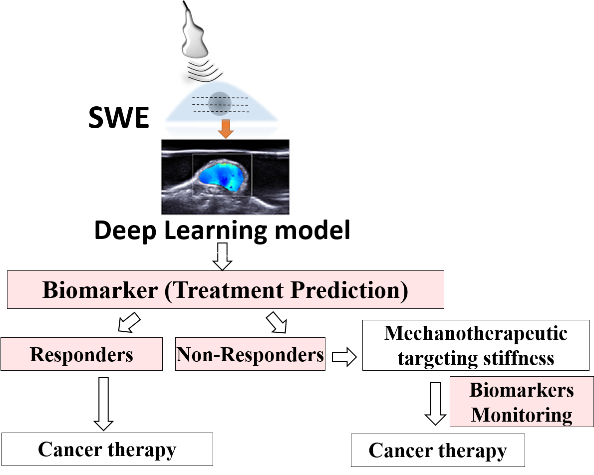 performed experiments in preclinical tumors models to obtain data for the training and validation of the deep learning algorithms. The new data sets were added to the data pool from experiments that we performed in our laboratory to increase the dataset that was used for the training and the validation of the deep learning algorithm. We found that processing of ultrasound b-mode and elastography images with our deep learning algorithm can accurately be used for automatic segmentation of murine tumors and to predict the efficacy of chemotherapy, immunotherapy or the combination of the two. The results of this work have been reported in two articles.