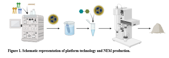 Over the course of the project duration, a process was developed for the formulation of LNPs which were subsequently dialyzed, upconcentrated and after the addition of excipients transferred into NEMs via spray drying.