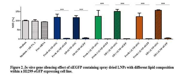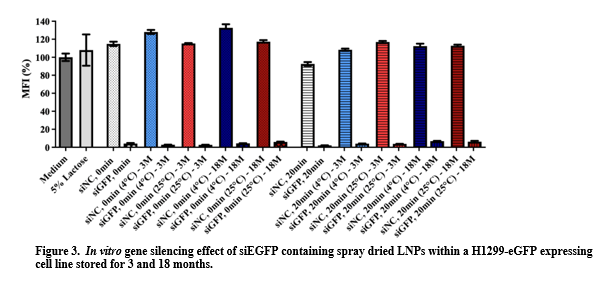 In order to evaluate the in vitro gene silencing efficiency of spray dried LNPs, they were assessed in H1299-eGFP cells, a lung carcinoma cell line with stably enhanced green fluorescent protein (eGFP) expression.