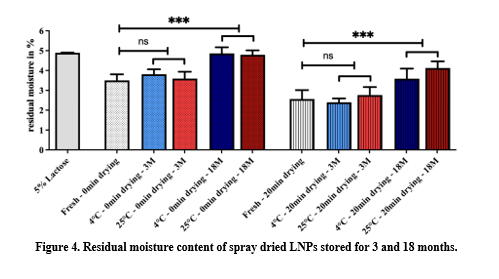 Additionally, formulations were developed that exhibit optimal powder properties for inhalation, with a mass median diameter (MMD) ranging from 1 to 5 µm and a high fine particle fraction (FPF) exceeding 60 %. A residual moisture content of less than 7% is crucial for both good storage stability and low susceptibility to microbial contamination of the formulations. This threshold was significantly undershot in both fresh spray dried formulations and after storage at room temperature and 4 °C for 3 and 18 months (Figures 3 and 4).