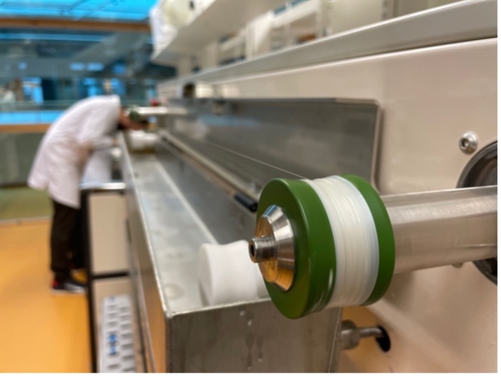 The grant allowed us to acquire a multifilament wet spinner with multiple baths, a drying line, a post-spin-stretch device, and a winder. By using this machine, we have been able to spin multifilament artificial spider silk fibers using solely aqueous solutions for the first time. By screening different spinning conditions, we could identify important parameters in the process and establish a protocol for stable fiber spinning. During the project, we produced 6kg of spider silk proteins, which is six times more than we anticipated, and managed to spin ca 500g of multifilament fibers from a part of this production batch. These fibers are currently being processed into yarns for subsequent benchmarking against established materials.
