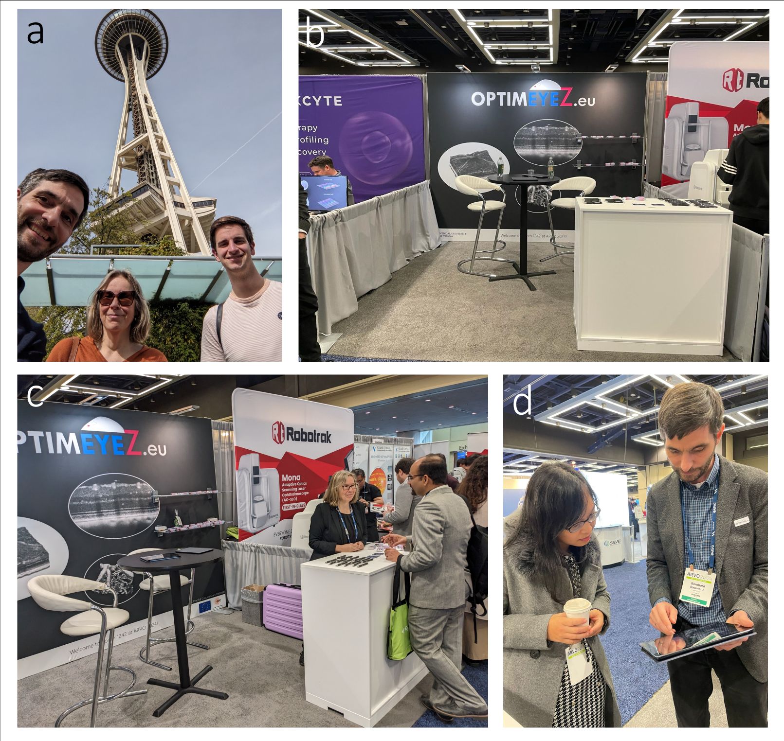 OPTIMEYEZ on tour. (a) The OPTIMEYEZ team in Seattle. (b-d) Impressions from the booth at ARVO 2024.