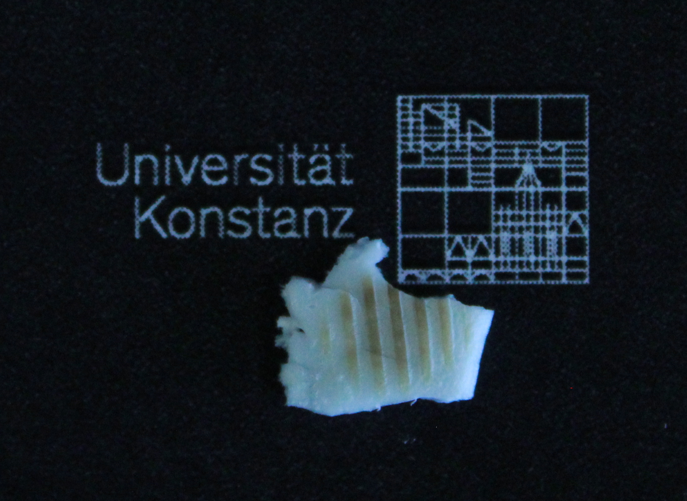 At the UKON, 4-Nitrophenylphosphate (4NPP) was used as a photolabile molecule for phosphate release. By adjusting the pH and the concentrations of the calcium source and the photolabile molecule, as well as the accessibility of CO2 from the air, we were able to find the perfect conditions to precipitate calcium phosphate. Also, we were switching to the synthesis of larger ring structures as photoactive agents, with more red-shifted absorbance than 4NPP. We performed full characterization of the molecules and the splitting mechanism (Absorption, NMR and titration experiments). We calculated that 4NPP has a photochemical quantum yield of 2 %, whereas the larger ring structures according to the NMR studies split off almost completely. Subsequently, a calcium source was inserted and in the case of 4NPP, a solid precipitate was obtained. Characterization (IR, pXRD, SEM/ EDX) doubtlessly shows that the precipitate consists of amorphous carbonate-apatite Type B. For the hard matrix in the case of 4NPP, an agarose-sucrose mixture was used, transparent to visible light; we also established other matrices: polyacrylamide and organic solvent-based matrices for the larger organic ring structures. We were able to cover wavelength ranges 390-460 nm, establishing a huge toolbox of photoinitiators, matrix precursors, and photolabile molecules to adapt the system for user needs. Nonetheless, the characterization of calcium phosphate inside the matrix, hard to achieve, is still under ongoing research. To sum up, we were able to precipitate a calcium phosphate locally inside a matrix and characterize it, which can be of great interest in the future for research on implant materials. At the University of Bologna, two novel routes were explored to reach the precipitation of calcium carbonate through the irradiation of a precursor in the liquid-state. (1) As a first approach, the source of calcium ions was modified from the original formula [Menichetti A. et al, 2021]: an aqueous suspension based on calcium ions and ketoprofen in the form of a fluid paste was investigated. The main work concerned the optimization of formulations. Upon LED irradiation the paste was quickly converted into amorphous calcium carbonate, as proven by IR-spectroscopy. Nonetheless, significant amount of the photo-reaction sub-products and water still remain in the final materials, affecting its mechanical properties and not making it actually suitable for 3D-printing. Indeed, further studies will be necessary to tackle these drawbacks. (2) As a second approach, the light-induced aggregation was performed by mixing calcium carbonate powder and a photocurable-polymeric resin. New formulas were studied by mixing calcium carbonate powder and a photo-polymer resin with different methods. The stability of the blend over time was checked, and it was confirmed that mixtures were stable in a time range suitable for 3D-printing processes. Simple 3D-models were printed by loading the 3D-printer with the novel formulas. The models appeared compact and regular in shape, and the chemical-homogeneity all over the objects was confirmed by IR spectroscopy. These sounded like great background for the next investigations.
