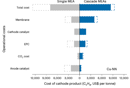 To assess the economic viability of electro-reduction of CO2 to C2H4 on Cu, Cu-NN, we carried out techno-economic analyses by comparing the direct conversion route (CO2-to-C2H4 in a single reactor) with the two steps cascade systems (CO2-to-CO, and CO-to-C2H4 in cascade system). We determined the OPEX of the direct and the cascade flow processes for the production of 1 ton of C2H4. In our calculations, we assumed a catalyst lifetime of one year (8,760 hours) and a total electrode surface of 100 m2. Figure 2 show the cost distribution for the different parameters, without considering the CO2 loss due to carbonate formation and membrane crossover as well as the downstream separation costs. Among the four different MEA configurations, we found that direct conversion of CO2 to ethylene using Cu-NN is the closest to profitability. Importantly the cost of ethylene production decreases from 12,600 $ ton-1 to 4,500 $ ton-1 using pristine Cu (dashed line) and Cu-NN (solid line), respectively, which corresponds to a 64% reduction.