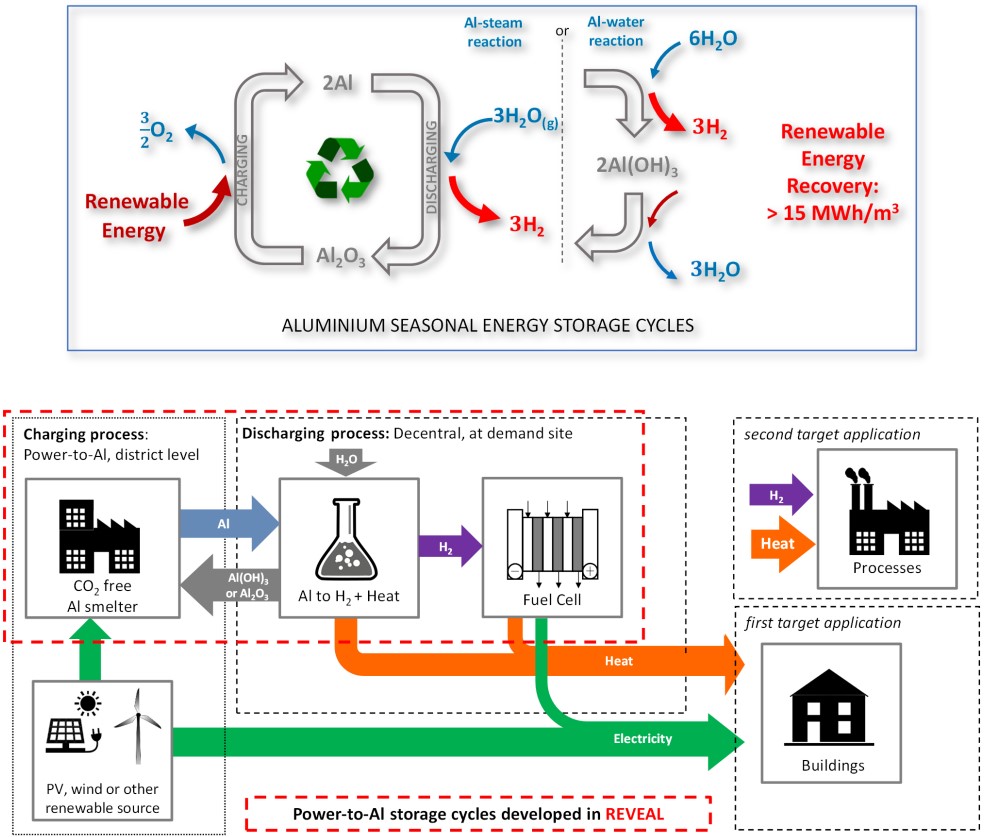 The game-changing and unique solution of the REVEAL project is using the conversion of aluminium oxide into elementary aluminium (Power-to-Al) to store renewable energy and produce a "renewable fuel" that can be stored loss-free for any desired time. When most energy is needed and electricity prices are high, renewable Al fuel is converted to heat and electricity in order to cover low temperature heat and electricity demand of buildings, or to cover energy demand for processes by providing high temperature heat and hydrogen.