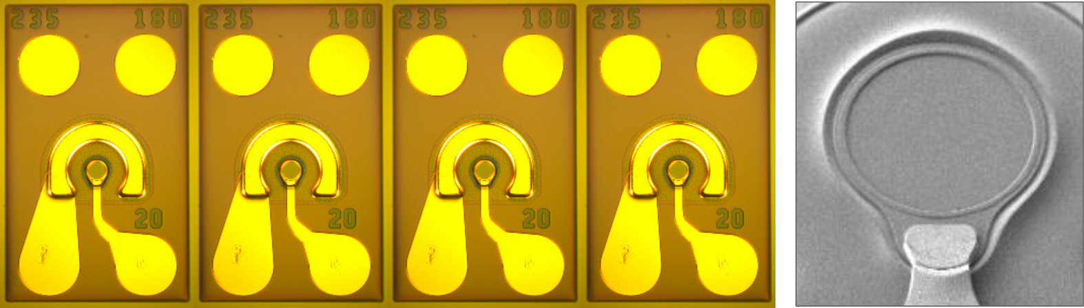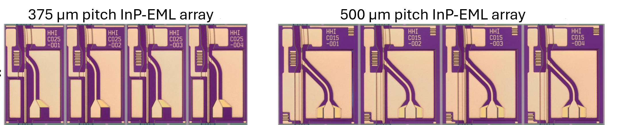Obj.1: InP-EML (Fig.1) and InP-PD arrays for the O-band multilane optical transceiver have been developed, exhibiting output powers of up to 20 mW and responsivities above 0.5 A/W. In addition, GaAs-based VCSEL arrays with flip-chip compatible pads (Fig.2) with output power above 3 mW and modulation BW over 30 GHz and flip-chip compatible InP PD arrays (Fig.3) (0.55 A/W, 30 GHz), operating at 1060 nm, were successfully developed. Finally, novel flip-chip PolyBoard interposers hosting VCSELs and PDs have been demonstrated for the first time, achieving propagation losses below 0.4 dB/cm.