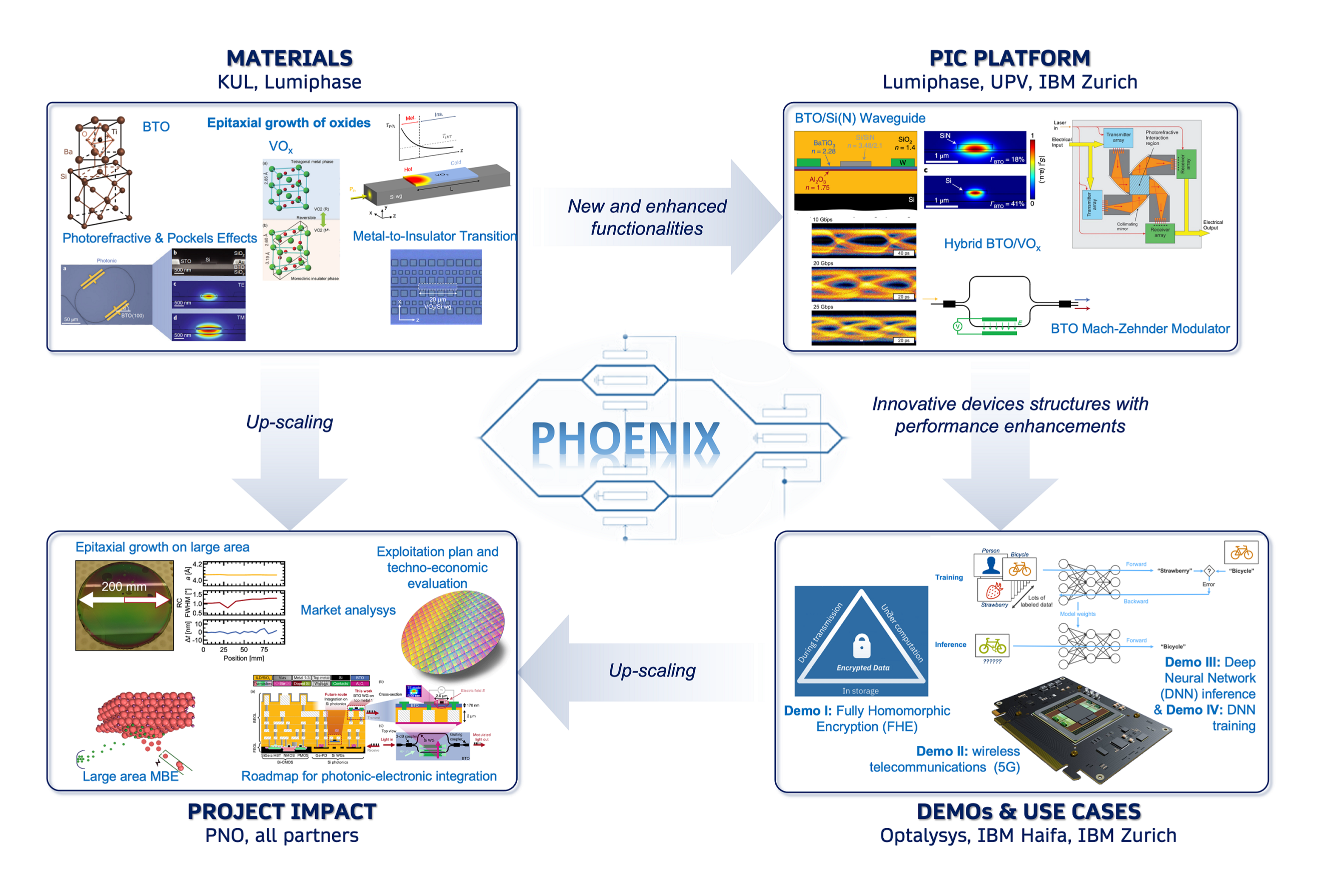 PHOENIX will develop a set of innovative materials and technologies beyond the state-of-the-art to enhance the functionalities of next generation PICs and reduce their footprint and power consumption. The developed materials and technologies will be demonstrated in four application use cases: neural network inference and training, fully homomorphic encryption and 5G. At the same time, the project will contribute to advance the growth of high-quality crystalline oxides by MBE on large area. The know-how and experience generated in the project will be transferred to more academic and industrial entities by dissemination under an Open Science approach.