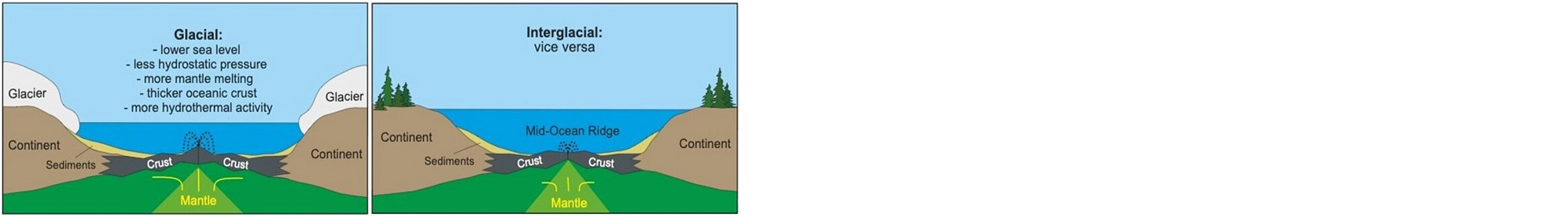The key hypothesis that we plan to test is if volcanism at mid-ocean ridges has oscillated inversely with climate induced sea level change. During glacial periods, lower sea level (due to storage of seawater in glaciers on land) resulted in less hydrostatic pressure on the ridges, thus there was enhanced pressure-release induced melting of the upper mantle, creating thicker oceanic crust and greater amounts of volcanism and hydrothermal activity at the earth’s surface. During interglacials, sea level is higher, suppressing mantle melting, resulting in thinner newly formed oceanic crust and less volcanic and hydrothermal activity along the ridges.