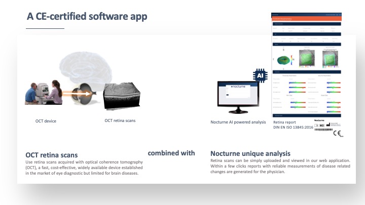 First studies for MS, and related diseases like Neuromyelitis optica spectrum disorders (NMOSD), acute optic neuritis (ON), and Idiopathic intracranial hypertension (IIH) have been published and show that Nocturne parameters can be used at the time point of the diagnosis and for monitoring purposes for further therapy decisions. Additionally, Nocturne is collaborating with UCLA, Glaucoma advanced image laboratory to develop a pipeline for identifying early patients with glaucoma that will have a more aggressive disease course. We see the potential to provide a similar value for PD, AD, and mild cognitive impairment (MCI).