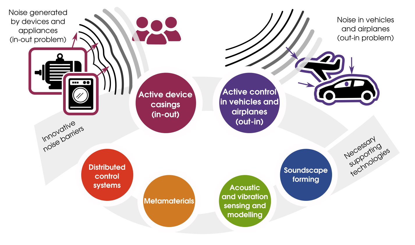 1. Develop comprehensive noise-reducing casing solutions that globally control the excessive noise generated and radiated by industrial devices and household appliances, whilst consuming much less energy, sensors and actuators than classical Active Noise Control (ANC) systems. This is referred to as the in-out problem.