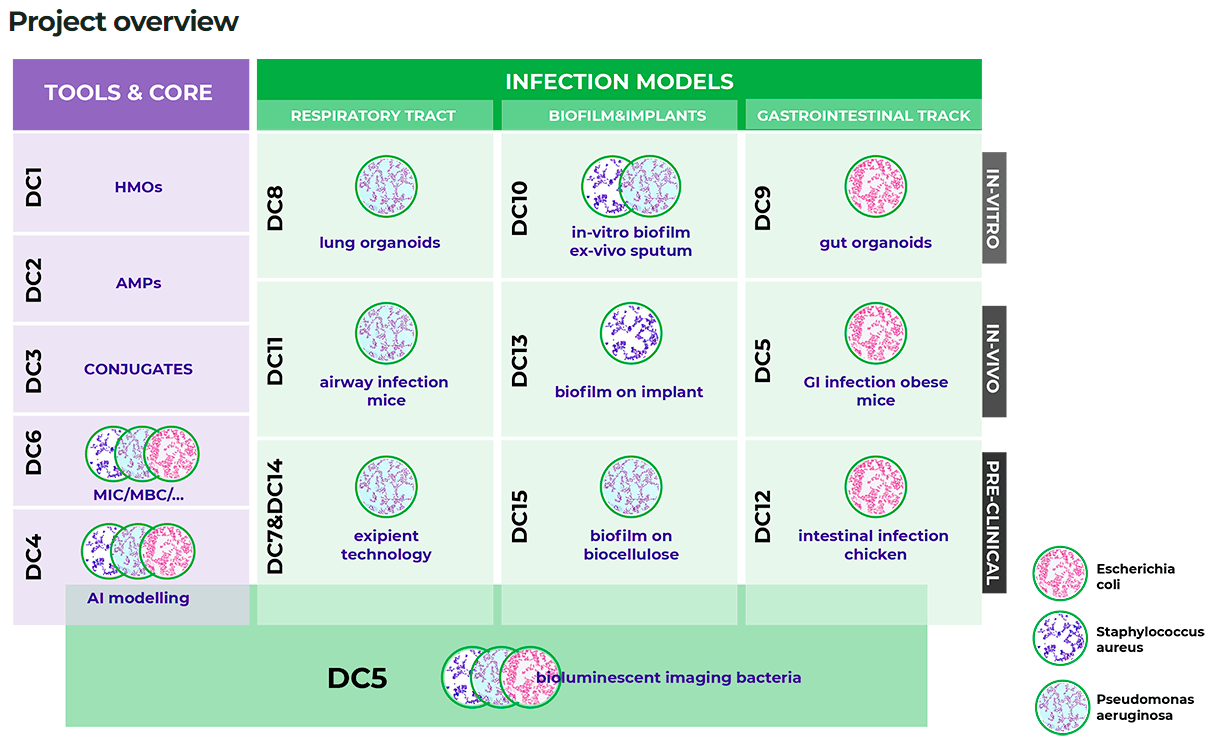 Efficacy of the new compounds is being determined in high-throughput in vitro screening assays. Preliminary data indicate that the new peptides, but not the oligosaccharides, act directly as antimicrobials on three of the target bacteria. Additionally, the new compounds were assessed for their ability to enhance the efficacy of conventional antibiotics, which could lead to a reduction in antibiotic use in patients and thus herewith lowering the chance on bacteria becoming resistant as well as reducing side-effects. Besides human pathogens, also different animal pathogens were found to be highly susceptible to the newly developed peptides, making these compounds applicable for the veterinary field. Knowledge of biosafety and off-target effects of our new antimicrobials is essential for application in humans and animals. Initial studies showed that none of the compounds induced cytotoxicity. Assessment of off-target effects, by investigating effects on microbiota in lungs and gut, indicated that some of these bacteria were highly susceptible, while others were highly resistant to the tested peptides. These findings, as well as impact on infection-induced immunity, will be further evaluated in vivo experimental models. To enable non-invasive imaging of pathogens, light emitting Escherichia coli, Pseudomonas aeruginosa and Staphylococcus aureus have been established. These bacteria are currently being tested before use in vitro and in vivo.