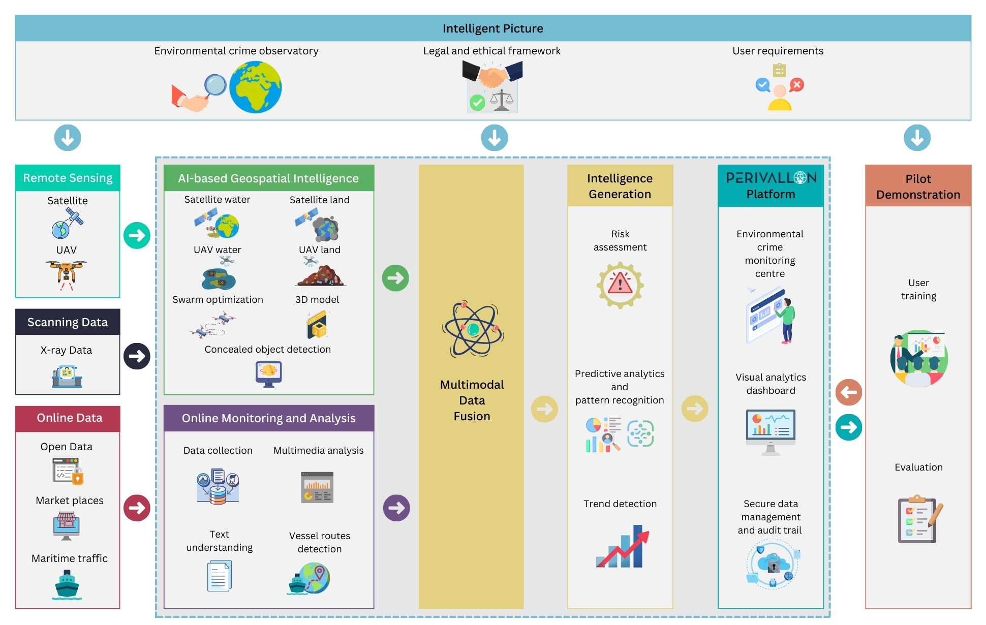 The project specifically tackles waste-related crimes as the top priority concern of practitioners. Intentional dumping of polluting substances, illegal disposal of (hazardous) waste, (cross-border) illegal trafficking of waste, and illegal trade of hydrofluorocarbons (HFCs) are examples of criminal activities prioritised by the end-users. Such forms of crime can be challenging to detect and difficult to investigate by conventional means, highlighting the need for more sophisticated solutions enabling remote identification, evidence collection, analysis and correlation of the information obtained. To this aim, the PERIVALLON platform integrates a collection of components to a single-entry point delivered to end-users that exploits the latest advancements in Artificial Intelligence (AI) in the fields of geospatial intelligence, remote sensing, online monitoring of marketplaces and open data sources, and multimodal analytics.