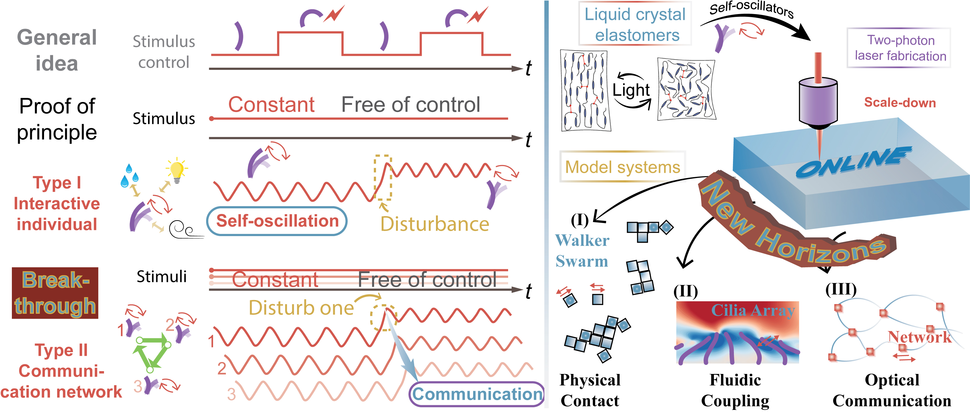 Why is this important? There exists an increasing need for artificial materials that can interact, alike biological systems. However, all the dynamic features of state-of-the-art responsive materials are based on internal material properties, and making individual materials interact with each other is a huge challenge. ONLINE proposes three new model systems for material communication: (I) Microscopic walker swarm, in which the locomotion and patterns of interactions between individuals can be fully programmed; (II) Cilia array that move cooperatively and self-regulate the fluidics at low Reynolds numbers; (III) Homeostasis-like light-communicating coupled network that provides a full set of tunable parameters to mimic the complexity of biological oscillators.