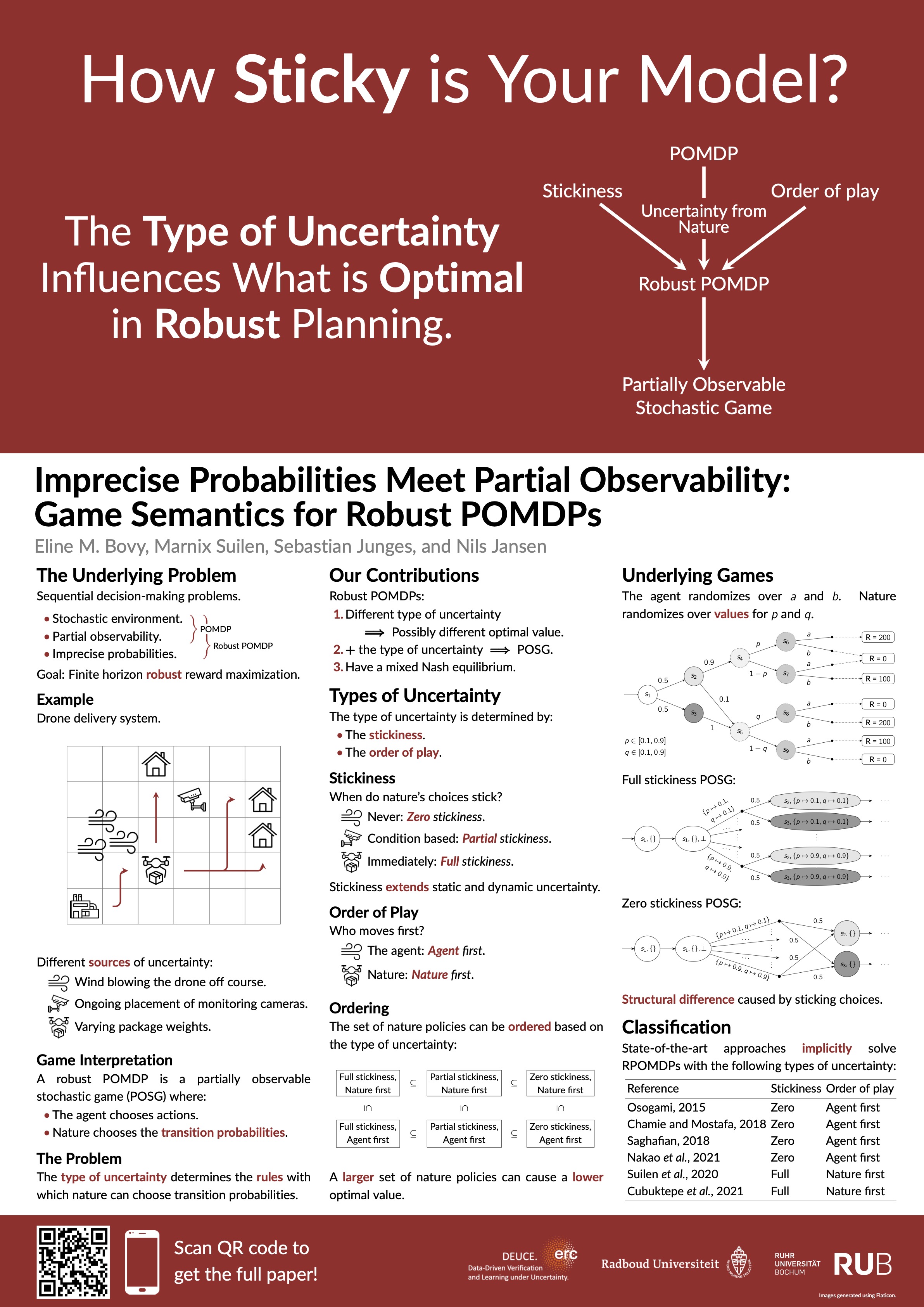For the third challenge, we provided a string of results that help the verification and learning of uncertain systems. As a highlight, we defined novel semantics for a complicated model: robust partially observable Markov decision processes. Our semantics help to understand uncertainty in a game-based fashion, published at IJCAI 2024. This work is already proving to have significant implications for the rest of the project and the research area in general. Moreover, we coined the term of 'active measuring' in reinforcement learning. Our techniques are able to actively exploit a system's potentially very expensive sensor, if the uncertainty is too high to make safe and correct decisions. One of the results in this stream has been published at AAAI 2024. Finally, we delved into safe and reliable offline reinforcement learning to account for the inherent uncertainty that occurs in offline settings with limited data. The first result handling partial observability is published at AAAI 2023.