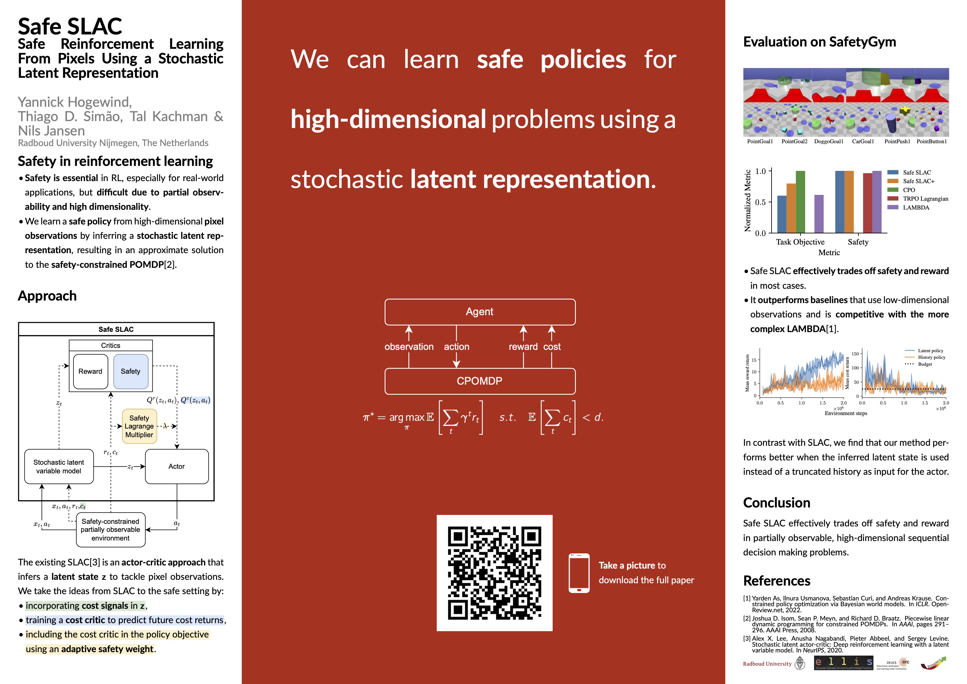 Within the first key challenge, handling complex and high-dimensional environments, we provided several results that tackle systems of high-dimensional representations, such as pixel representations or multi-agent settings. We highlight one of the first works that performs safe reinforcement learning from pixels, published at ICLR 2023, and a novel approach to handle multi-agent systems that operate under partial information and uncertainty with many agents, published at AAAI 2024.