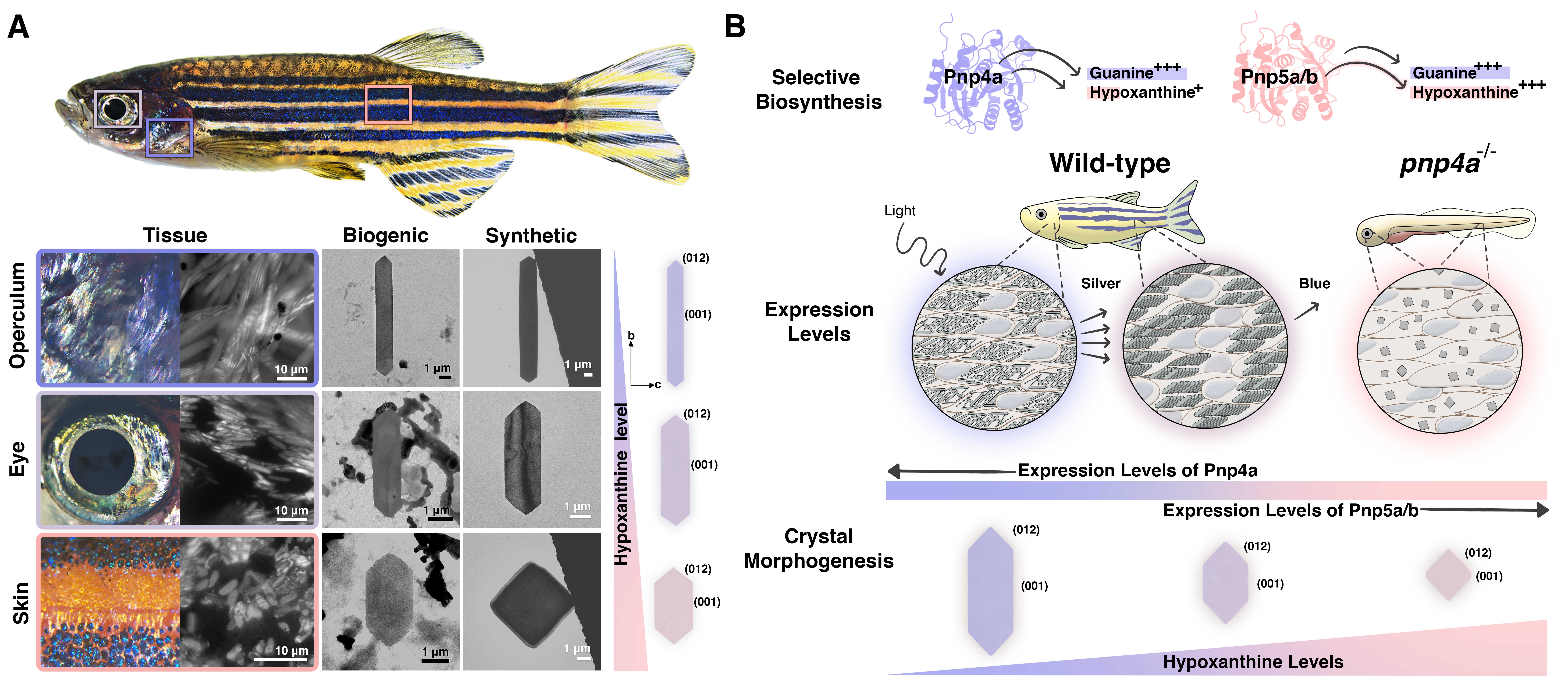 Beyond biology, these results offer a foundation for developing bio-inspired materials that mimic the optical properties of these crystals. Specifically, the precise control of crystal morphology and assembly observed in zebrafish cells could guide innovations in photonics or nanotechnology. Furthermore, the biosynthetic pathways identified for guanine and uric acid could be harnessed for the bioengineering of biofactories, such bacteria and yeast for the production of these important metabolites. To fully realize these applications, further research is needed to translate these biological principles into scalable and practical technologies.