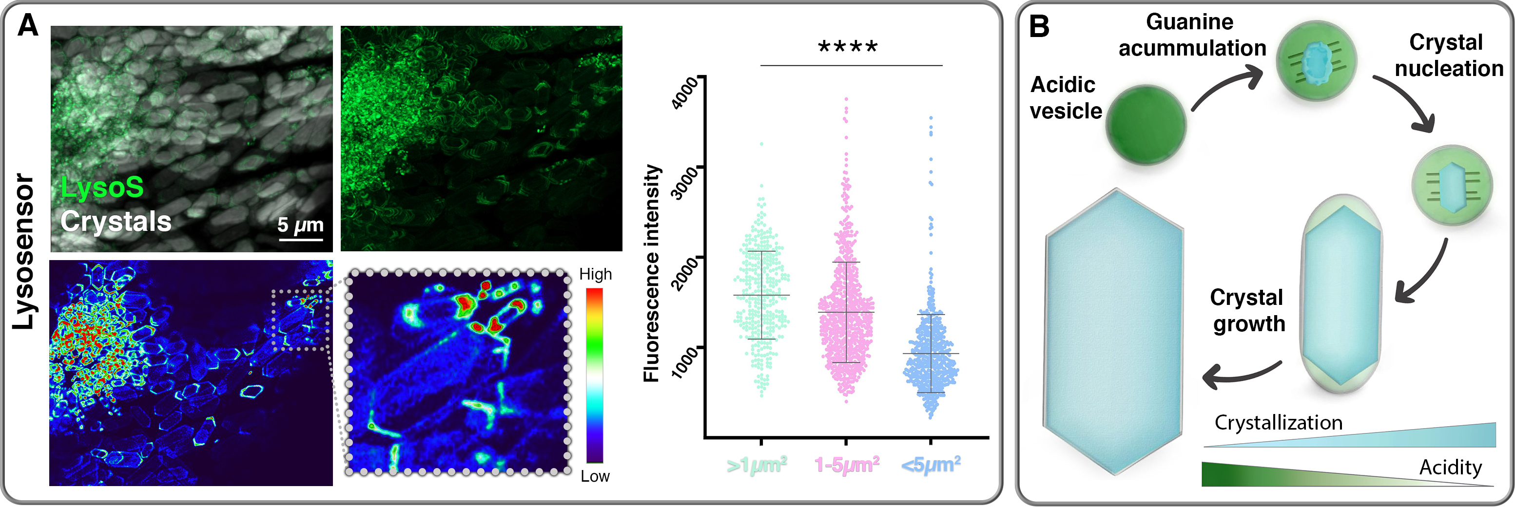 pH as a Driver for Molecular Crystallization: We revealed how organelle pH modulation drives guanine accumulation and crystallization. By employing live-cell imaging, cryo-electron microscopy, and synchrotron spectroscopy, we demonstrated how pH transitions regulate crystal formation in iridophores, offering critical insights into organelle function and maturation.