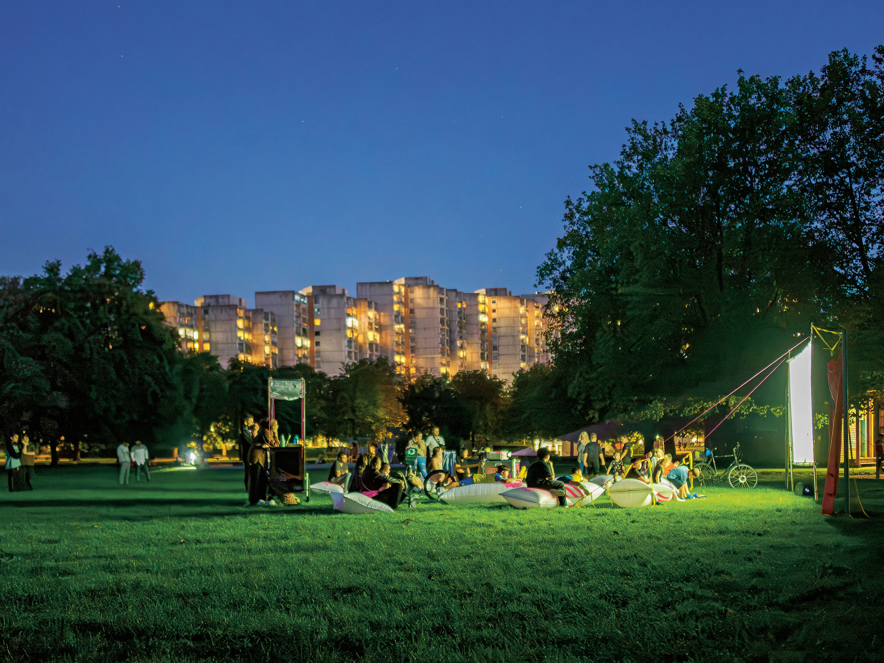 Cultural Places for Young People: Walks with audio stories / mobile Ciné Vélo Cité / CHILLspORT permanent schoolyard redesign through cultural process with pupils, students, artists.