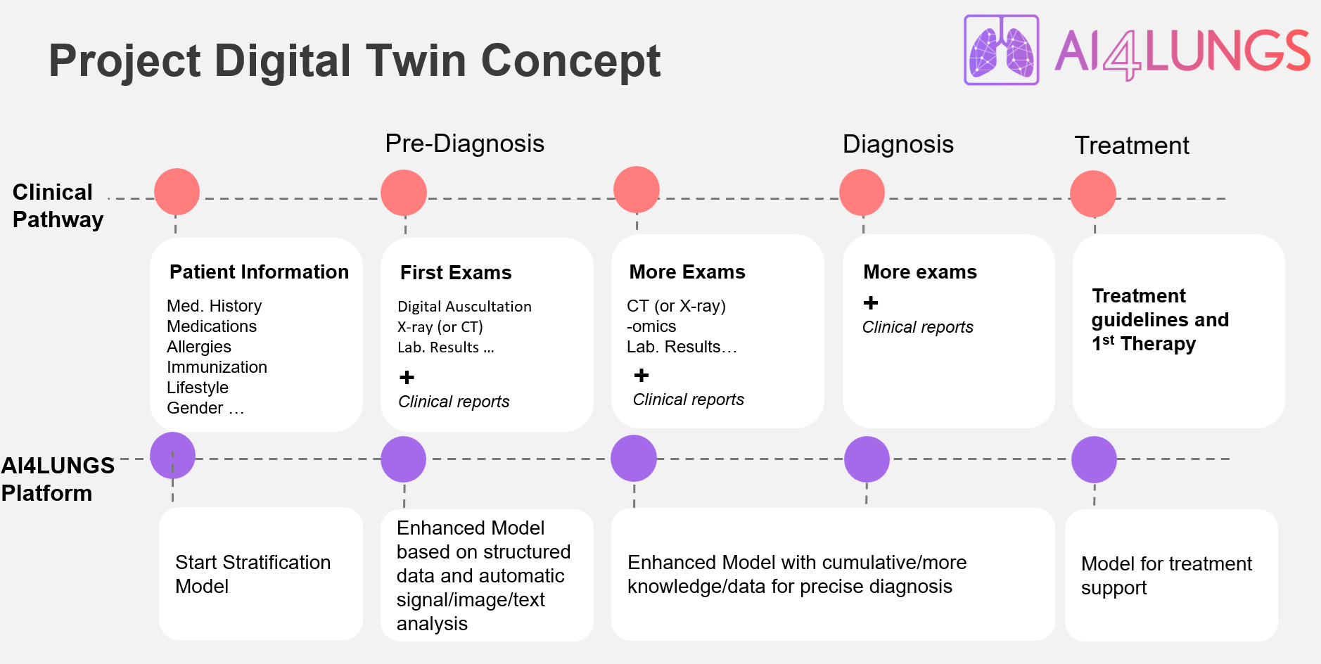 AI4LUNGS’ ambition is to successfully create and validate AI tools and computational models to improve patient stratification, ultimately optimising diagnosing and treating respiratory diseases - Interstitial Lung Diseases (ILDs), Infectious Diseases and cancer. It aims to support physicians in their decision-making during the diagnosis and treatment processes, streamlining and digitalising procedures, potentially saving time and reducing the need for numerous examinations compared to traditional approaches. The feasibility and efficiency of the developed solutions will be incorporated into a single system with a UX/UI dashboard to be evaluated in 2 pilots.