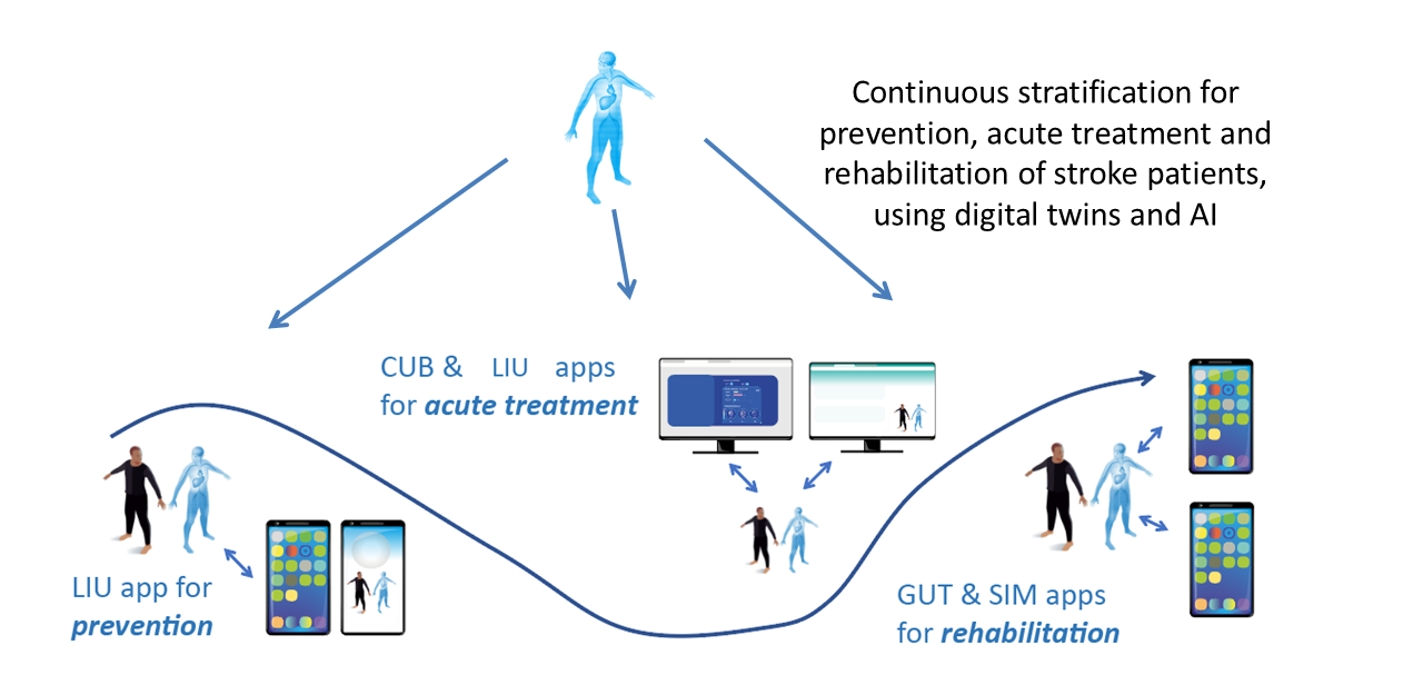 Stroke is one of the most common causes of death, and a major contributor to serious, long-lasting handicaps. It is therefore of high importance to both prevent strokes from happening, and to treat and rehabilitate patients optimally, when a stroke has occurred. A complicating factor is that all phases of this journey involve different actors, data, and patho-physiological processes, which are currently not integrated with each other. We have in previous projects developed a world-unique technology, which could fundamentally change this situation: physiologically based digital twins. What makes our digital twins unique is that they describe physiological processes in all relevant organs, including their cross-talk, and including a connection to statistical machine-learning models. However, these digital twins have not yet been tested and implemented in stroke prevention and care. The objective of this project is therefore to make use of digital twins and AI, to aid in both prevention, acute treatment, and rehabilitation of stroke patients. The goal is that this AI-approach should lead to continuous stratification (hence the name: STRATIF-AI), meaning that any time new data about the patient is produced, these data update the patient's digital twin, which then leads to an update of the patient's diagnosis and treatment assessments. This is obtained by having all data about a patient be copied to that patients Personal Data Vault, which together with the twin and a visualization engine makes out the back-end of our new platform. This backend is then communicating with a series of different eHealth applications, which are used both by patients and their caregivers. In this project, we will both develop these twin models, the technology, and test it in practice, in two different clinical studies: one larger study on prevention (N=300), and a pilot study for rehabilitation. The potential of this project is to lay the basis for a new expandable healthcare system, which supports P4-medicine: Preventive, Predictive, Participatory, and Personalized medicine.
