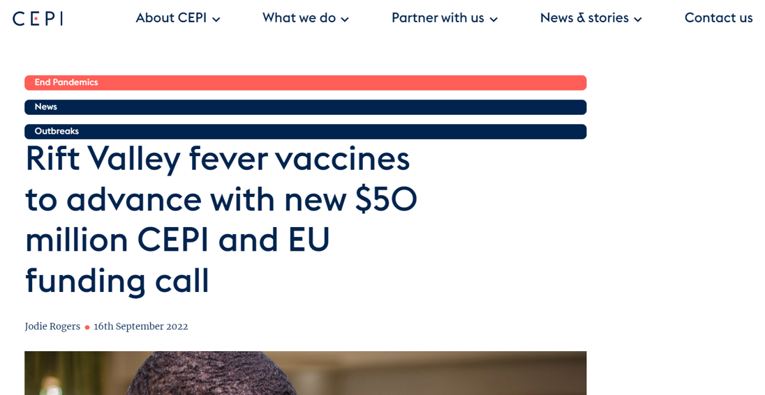 Despite first being identified in the 1930s, the disease is vastly under-researched, with no vaccines or other treatments currently available for human use. Under this project and building on earlier work including a Phase I trial of a vaccine candidate, CEPI is working with applicants to advance the development of vaccines against RVF with a focus on endemic regions and underpinned by the principle of equitable access. The project has the following objectives: