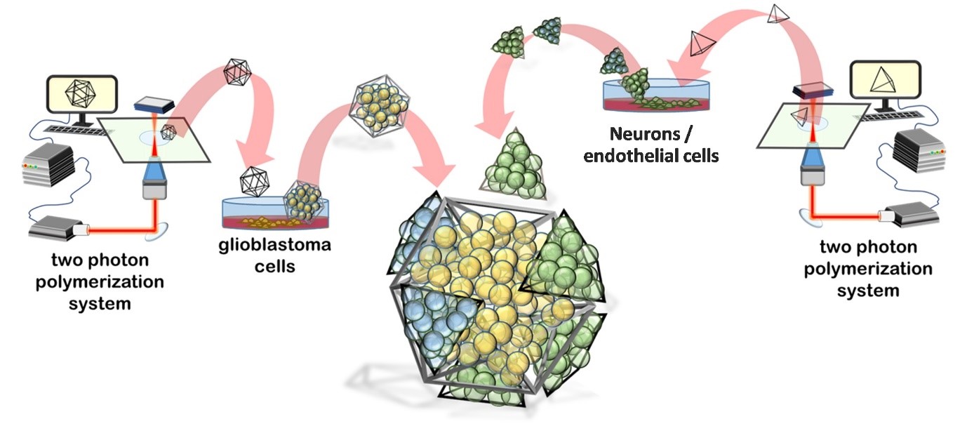 Two-photon lithography (TPL) represents an innovative technology, which allows fast prototyping of 3D structures with nanometer resolution for many applications. This microfabrication approach is exploited to reproduce different 3D microenvironments, featured by several physio-pathologic conditions. In MagDock, we proposed a 3D multi-culture system on magnetic scaffold self-assembly, faithfully mimicking GBM microenvironment complexity (Figure 1). Specifically, modular magnetic structures bear GBM cells, neuronal cells, and endothelial cells. Tumor core will be obtained by culturing GBM cells inside a magnetic scaffold shaped like a great dodecahedron. Healthy cells are instead cultured on tetrahedron-shaped magnetic scaffolds, that assemble around the tumor core by interfacing to its complementary indentations and thanks to magnetic interactions. Finally, vascular-mimicking tubular structures, serving as scaffolds for endothelial cells, assemble on the external part of the 3D multicellular system to mimic the presence of the blood-brain barrier.