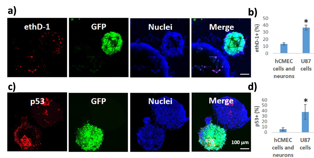 The nutlin-3a (nut-3a) anticancer drug was selected as testing molecule, since previous evidence indicated selective anticancer effects toward GBM cells. The viability of malignant cells (GFP-U87 GBM cells) in GDs and of non-malignant cells (hCMEC/D3 brain endothelial cells and hNSCs-derived neurons) in Ts has been assessed in terms of cells positive for ethidium homodimer-1 (ethD-1, Figure 2a). Results showed a significantly higher % of ethD-1+ malignant cells (36.7 ± 3.6%) versus non-malignant cells (13.5 ± 1.5%; Figure 2b). Immunofluorescence analyses were then performed to investigate whether the increased cell death was specifically induced by nut-3a through the activation of the p53 apoptotic pathway (Figure 2c). Our findings report a significantly higher % of p53+ malignant cells (37.8 ± 13.4%) versus non-malignant cells (5.8 ± 2.9%, Figure 2d), suggesting that the higher % of GBM dead cells is associated with a higher expression of p53, which is known to be pharmacologically activated by nut-3a.