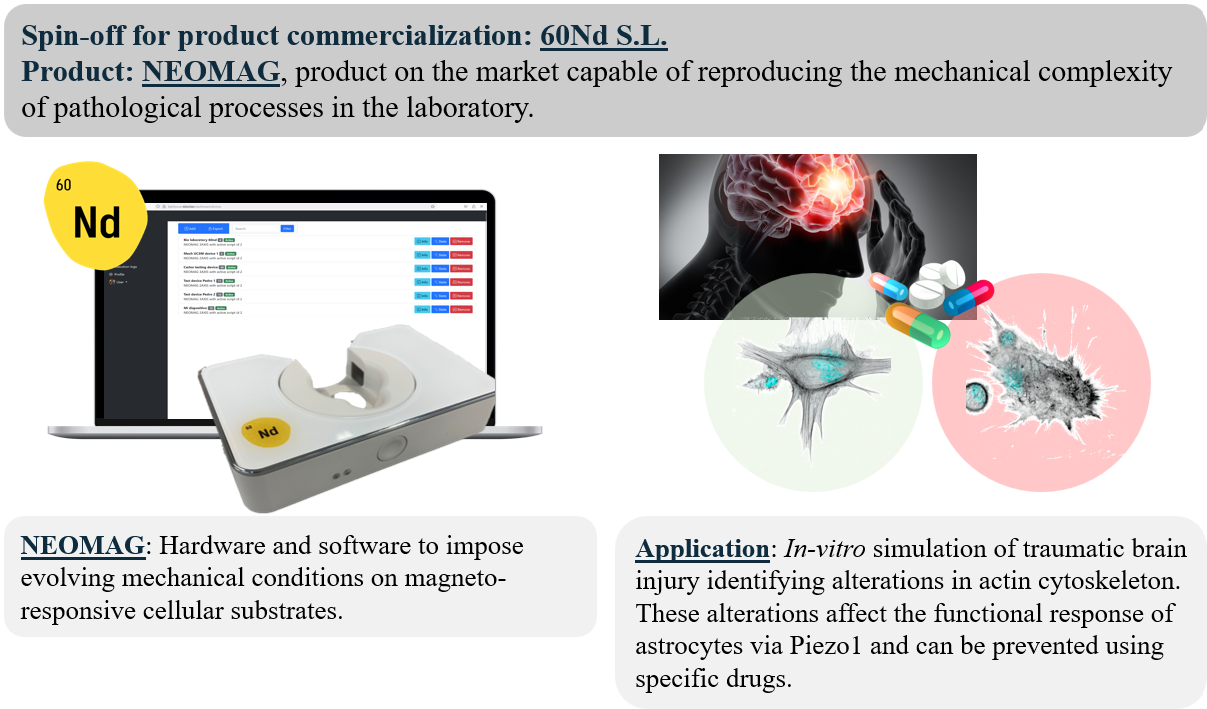Overall, NeoMag represents a revolutionary tool for mechanobiology research and its translation into industrial and clinical settings. During ISBIOMECH, we created the spin-off 60Nd S.L. to commercialize the system. The NeoMag platform will offer significant benefits in the development of drugs and therapies by addressing the often-overlooked mechanical effects on biological systems. By anticipating potential failures related to mechanical factors, it will enable a reduction in development time, costs, and risks, ensuring a more efficient and reliable process. Moreover, this approach enhances the quality and efficacy of drugs and therapies by incorporating critical mechanical considerations early in development. For research groups, NeoMag opens new avenues for exploration, allowing for the initiation of innovative research lines and novel approaches to studying complex biological processes.