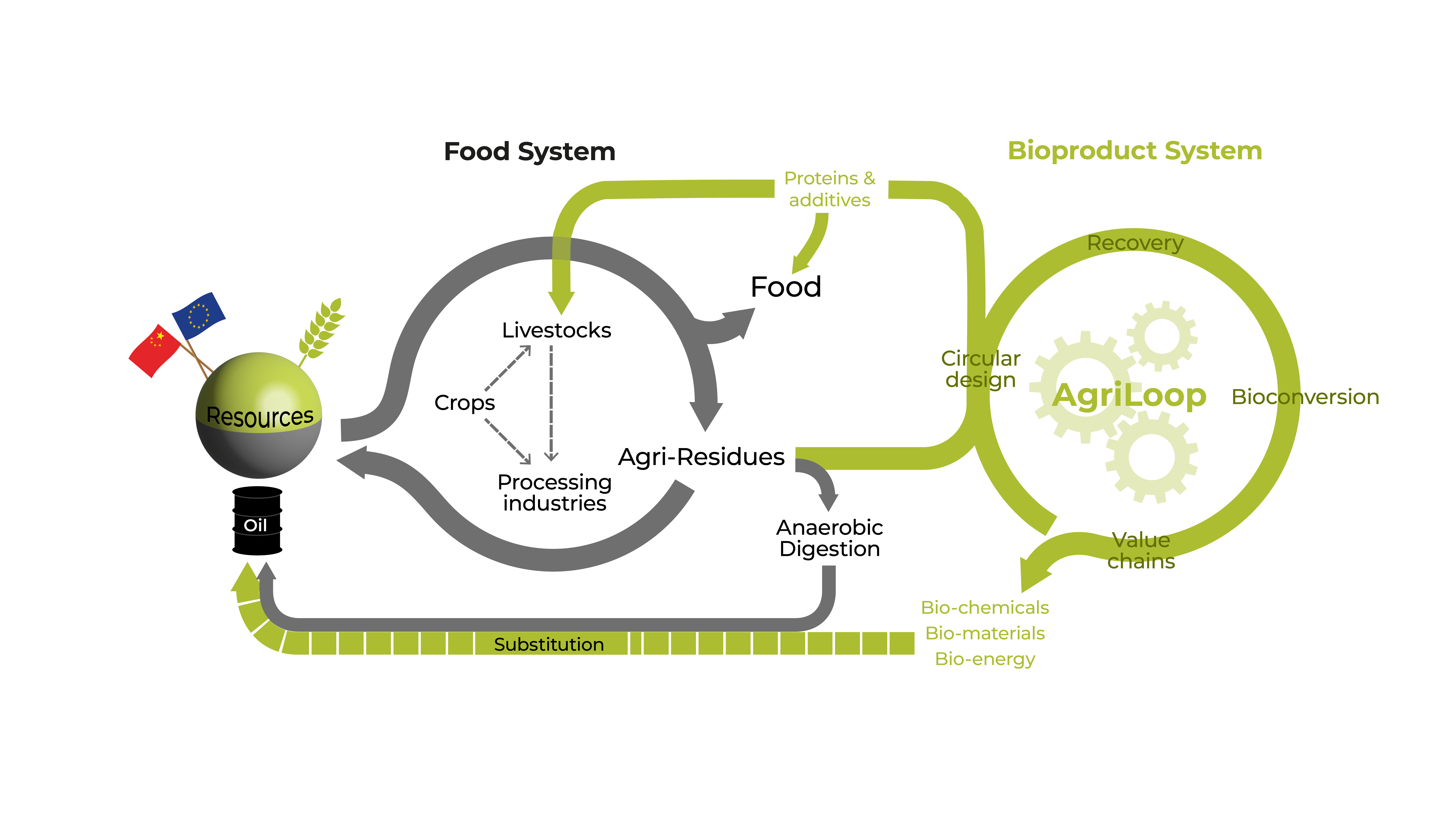 AgriLoop aims to extend the agricultural production value of two major global bioeconomy players: the EU and China, by eco-efficiently upgrading underexploited residues into a portfolio of high added-value bio-products able to generate new bio-based markets or to compete with, and gain market share of, oil- and food crops- based equivalents. AgriLoop will develop safe-and-sustainable-by-design (SSbD) bioconversion processes integrated in a cascading biorefinery approach to convert a range of agri-residues into plant and microbial proteins, polyesters and other bio-based chemicals to be used for food, feed, health and materials applications, especially by the farming sector.