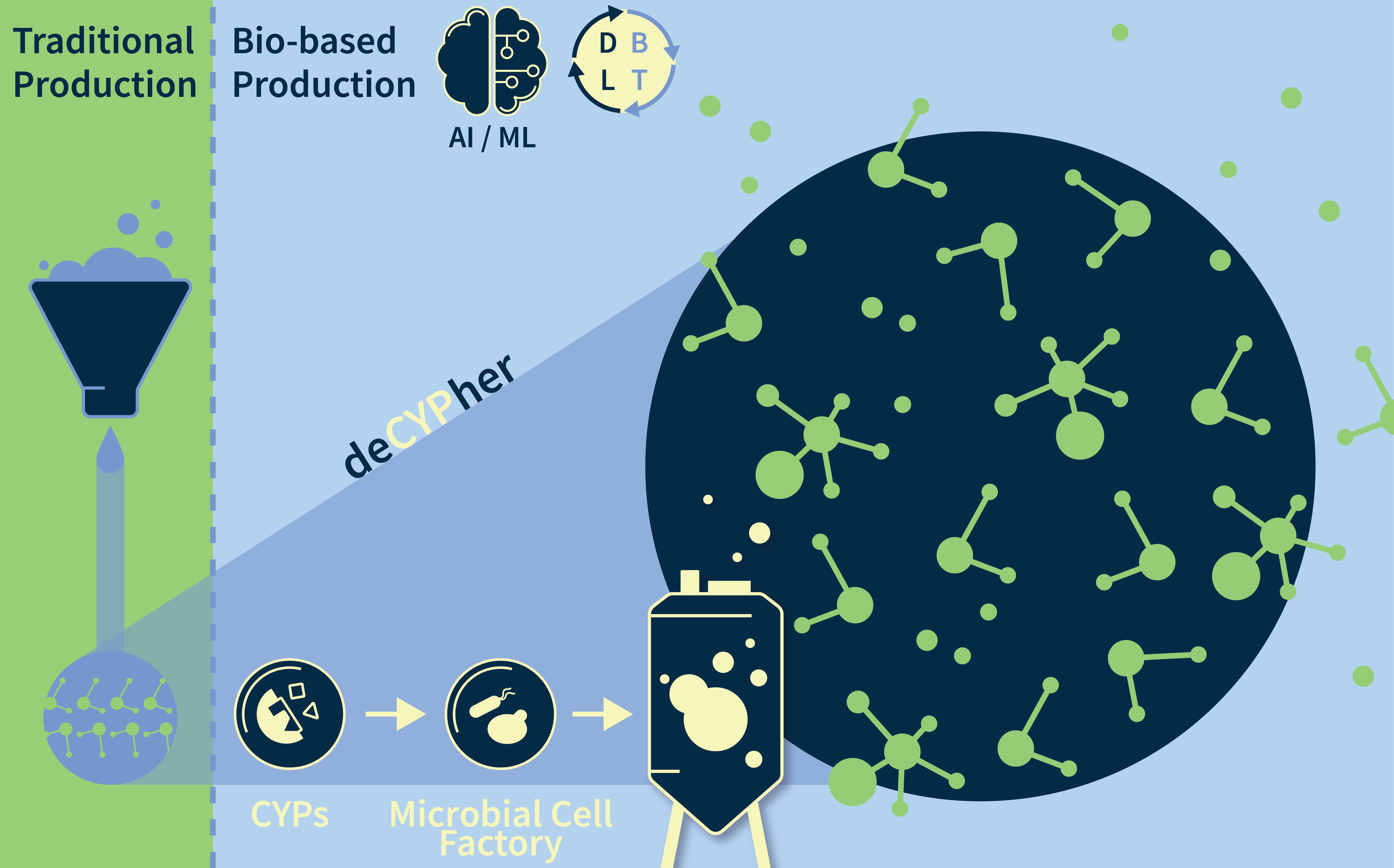 At the same time, artificial intelligence (AI) and machine learning (ML) are advancing rapidly, yet their potential in engineering biology remains underused. The deCYPher project bridges this gap by developing a standardized AI/ML platform to unlock the microbial production of OPMs, making these high-value molecules more accessible for industrial and societal applications.
