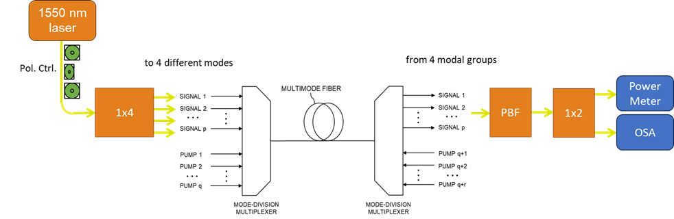An optical signal transmission setup was implemented: pumps were injected at the transmitter or at the receiver sides and optimized according to numerical simulations. Signals and pump were directly applied to the modal multiplexers and coupled to distinct modes.