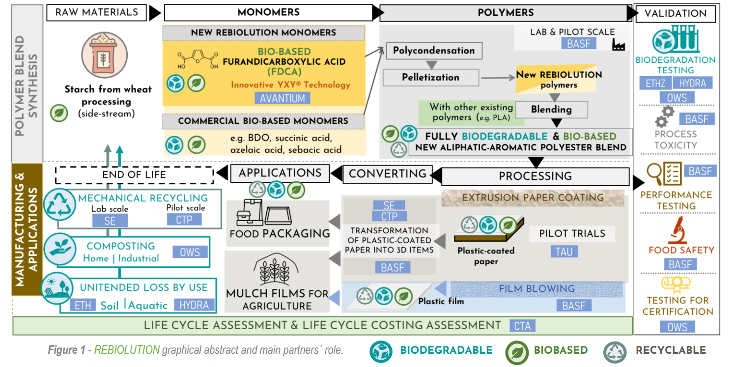 REBIOLUTION aims to design and synthetize novel fully bio-based and biodegradable polyester blends based on 2,5-Furandicarboxylic acid (FDCA) and other bio-based monomers fit for specific product-market applications selected in this project for their widespread use and negative impact on the environment: (1) plastic coating for food packaging (e.g. for frozen/chilled food or ready meal trays) and (2) mulch films for agricultural applications.