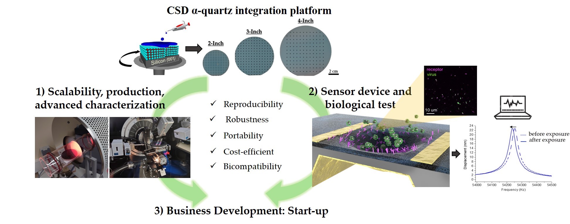 With these promising results, the QOVID project is poised to transform these innovation findings into a marketable commercial product for the medical and biotechnological sectors.Our goal now is to continue the development of a low-cost and sensitive virus detection tool, a sensor terminal composed of ultra-thin high-quality factor piezoelectric epitaxial quartz MEMS with a nanometric motion from MHz to GHz integrated on silicon technology and on a modular PCB technology ready to use for biological applications.