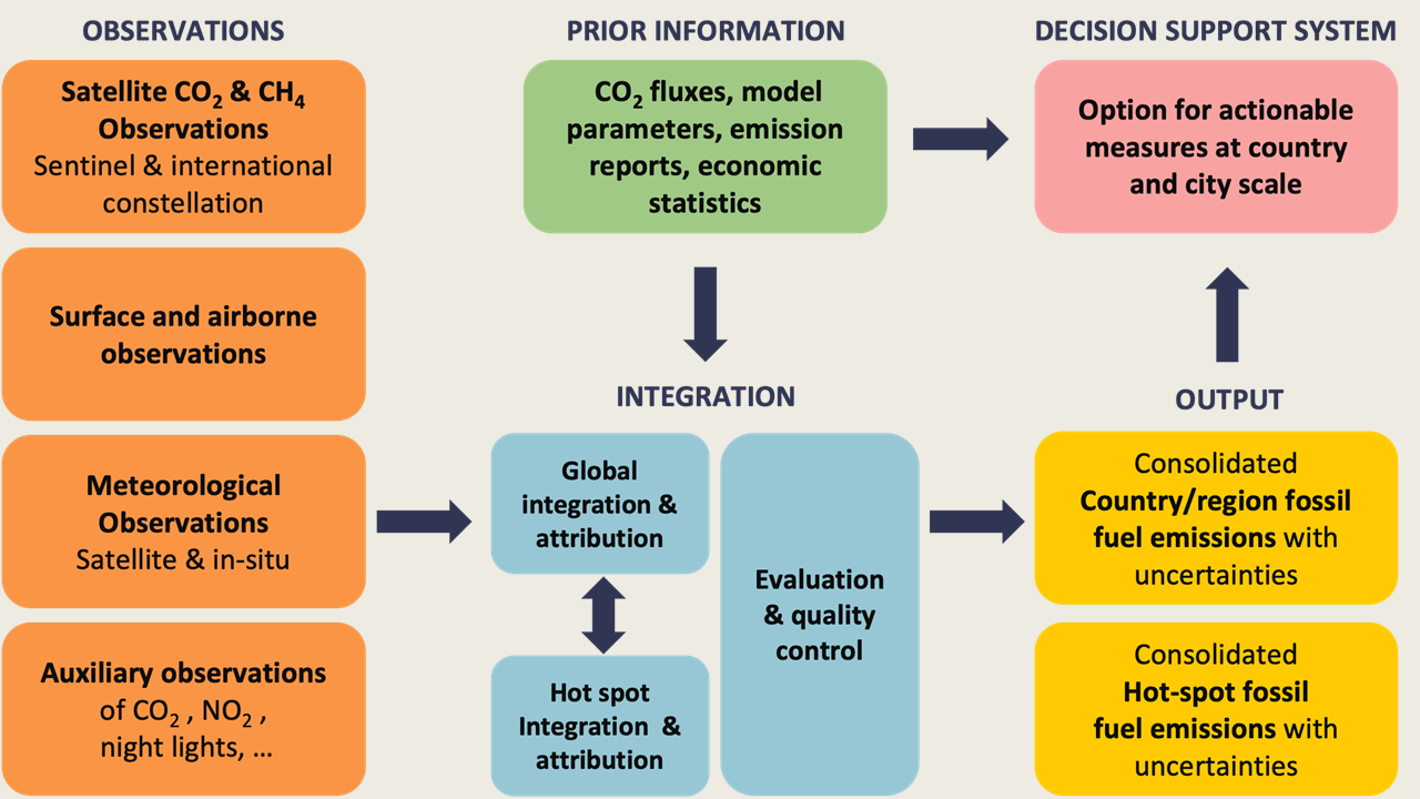 The main objectives of CORSO are to deliver further research activities and outcomes with a focus on the use of supplementary observations, i.e. of co-emitted species as well as the use of auxiliary observations to better separate fossil fuel emissions from the other sources of atmospheric CO2. CORSO will deliver improved estimates of emission factors/ratios and their uncertainties as well as the capabilities at global and local scale to optimally use observations of co-emitted species to better estimate anthropogenic CO2 emissions. CORSO will also provide clear recommendations to CAMS, ICOS, and WMO about the potential added-value of high-temporal resolution 14CO2 and APO observations as tracers for anthropogenic emissions in both global and regional scale inversions and develop coupled land-atmosphere data assimilation in the global CO2MVS system constraining carbon cycle variables with satellite observations of soil moisture, LAI, SIF, and Biomass. Finally, CORSO will provide specific recommendations for the topics above for the operational implementation of the CO2MVS within the Copernicus programme.