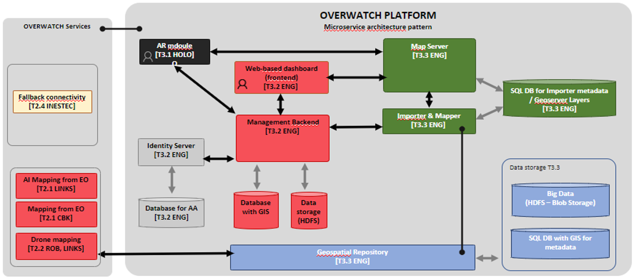 WP3 - Geospatial AR Decision Support System, started at M8 with bi-weekly teleconferences in tandem with WP2 given the strong connection between the OVERWATCH services and the infrastructure, and the major overlap in the involved technical partners between both WPs. The focus of activities was mainly on the harmonization of the objectives of each task of WP3 with the system, functional and user requirements defined in WP1. At current stage, main achievements of WP3 are the system architecture definition, and the definition of the technological stack to be adopted for the implementation of the entire architecture was consequently defined. For each component involved in the architecture, the basic flows of interaction have been defined and designed in relation to delineated use case scenarios. WP3 has already delivered a prototype of the OVERWATCH dashboard. relative deliverables (D3.1 “AR Geospatial holographic map”, D3.2 “Management system and AI decision support” and D3.3 “Geospatial repository & mapper”) are foreseen to be delivered at M29.