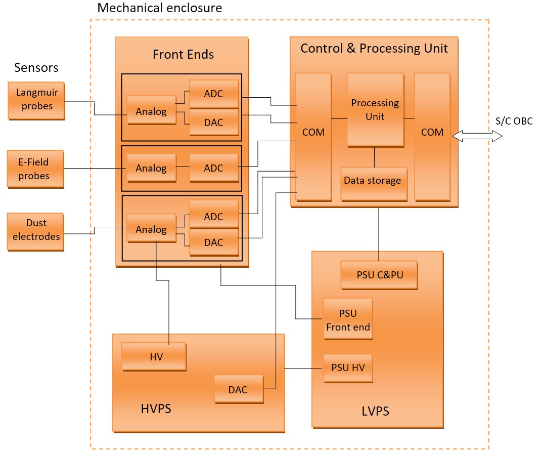 - Three sensors: a Langmuir probe, an electric field (E-field) sensor and the DUST sensor.