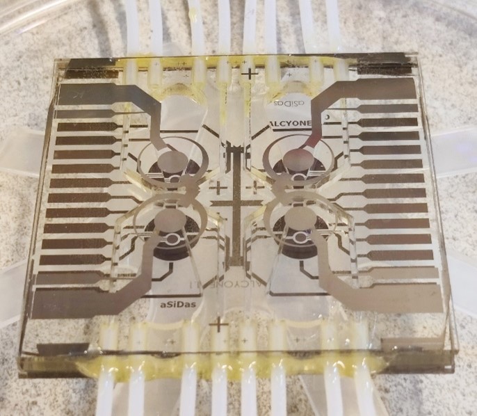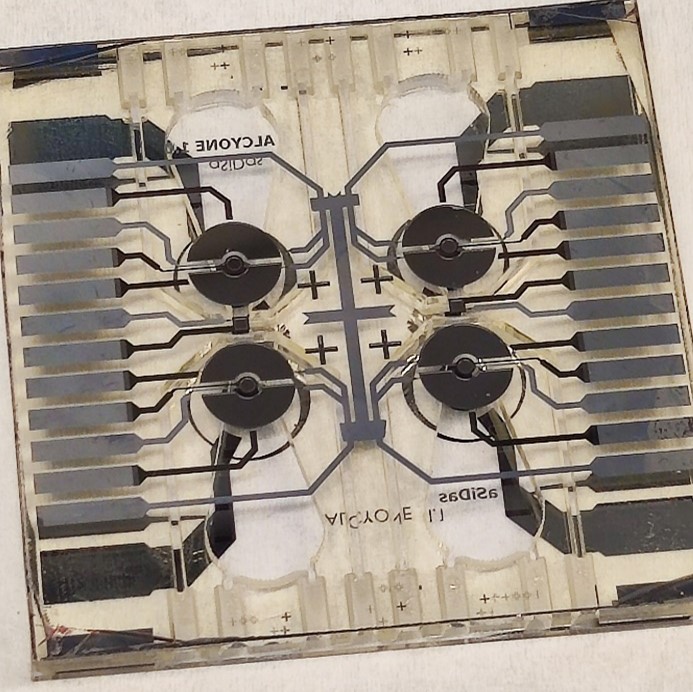 - Geometry and materials optimized for micro-gravity conditions with sidewall microfluidic connections and sandwich-type electrical contacts.