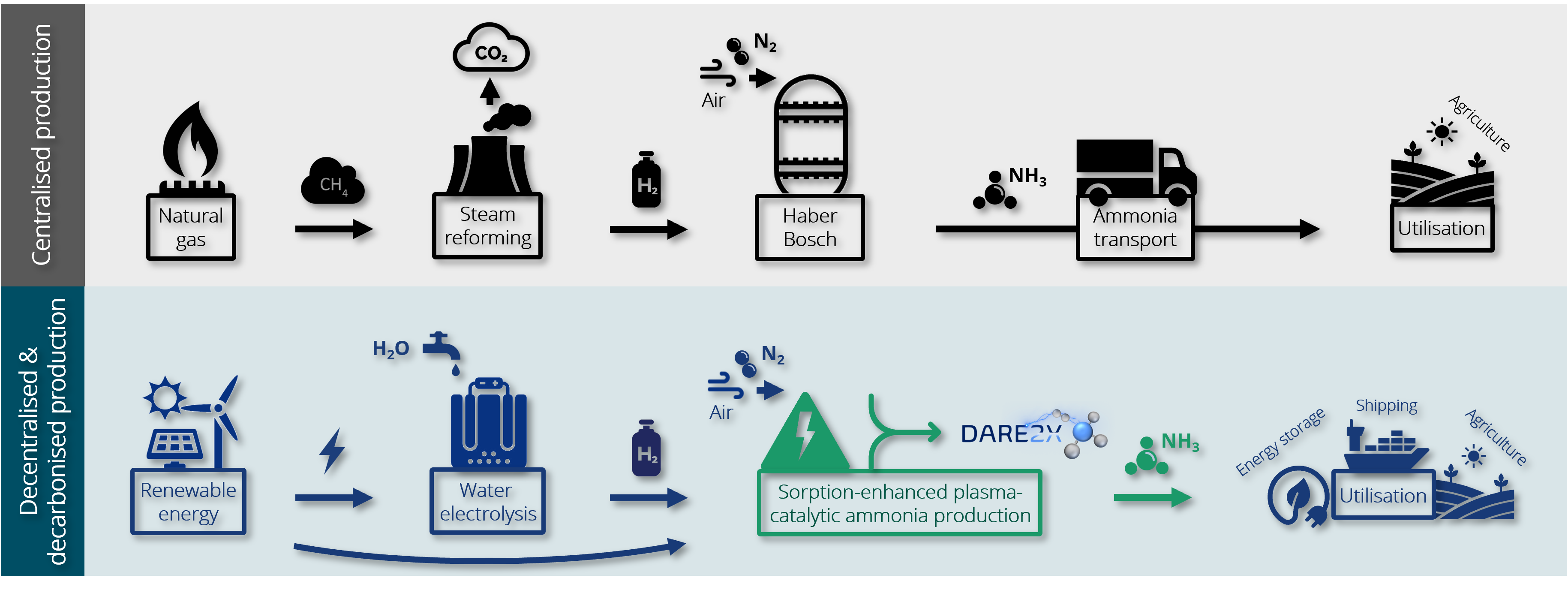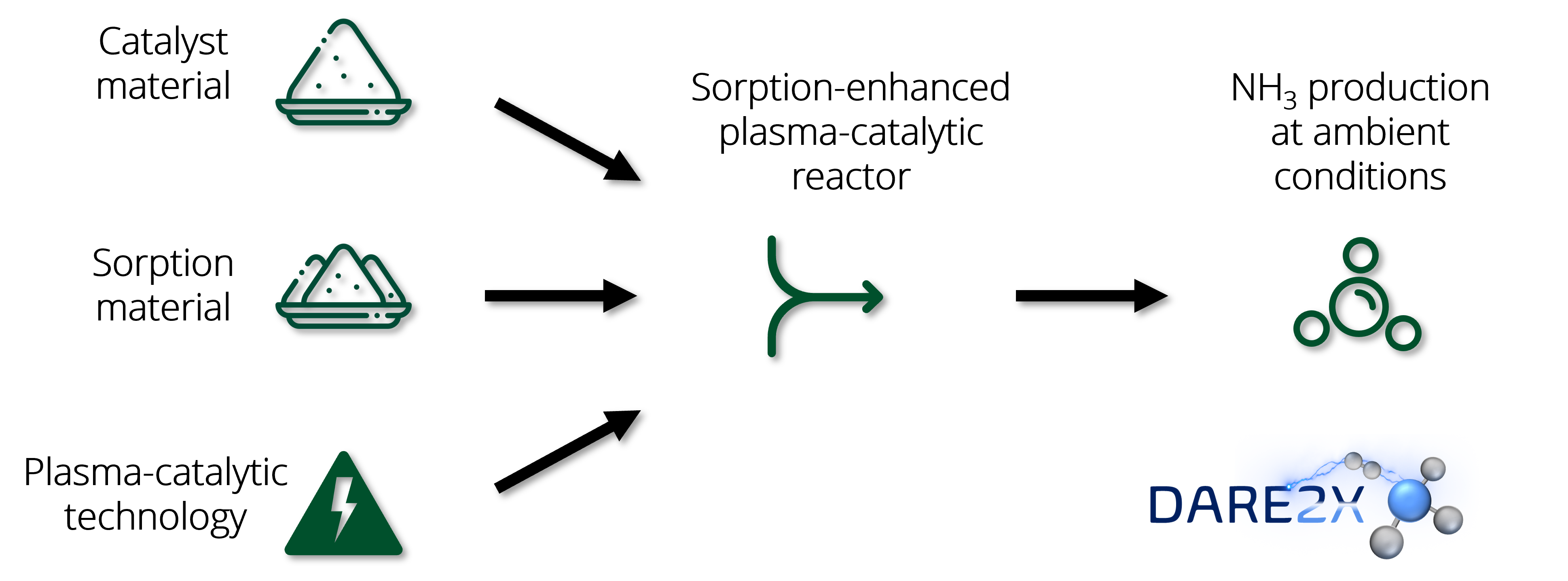 The main challenges for realising European green NH3 production is to transition away from fossil fuel-based, centralised Haber-Bosch facilities, to decentralised, dynamic systems that can be coupled directly to renewable electricity generators at or near the point of use. This does, however, require significant developments. DARE2X will overcome these barriers through the following game-changing solutions: (i) reactors utilising non-thermal plasma to drive NH3 synthesis; (ii) novel, more active catalysts using low-CRM materials, iii) stable and efficient NH3 sorption materials for in-situ NH3 separation. These innovations will be integrated into a single sorption-enhanced plasma-catalytic device that will be validated at TRL4. The economic, environmental and social feasibility will be assessed through LCA, LCC and a social acceptance study.