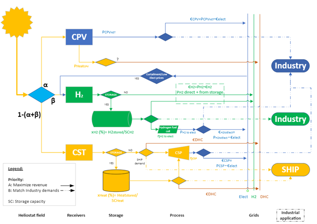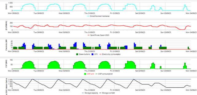 KTE1 - Smart solar resource management: Great advances have been made in the development of the smart solar resource management. The parametrised optical model, DNI now-casting method and Solar management adaptive strategy are defined and will be validated experimentally. These works integrate the technical requirements from each receiver. These models are being integrated into a parametrised electrical/thermal/chemical model and in tecno-economic assessment tools such as EnergyPro and Hydesign. A huge work to define the adequate interfaces between the models has been implemented (Figure 1) and will allow to assess the SOLARX impact in a large variety of applications (Figure 2), locations and regulation scenarios. First simulations of simplified configurations have been implemented (Figure 3). These simulations integrate the demands and spot prices in real-time to control the production of the different energy vectors.