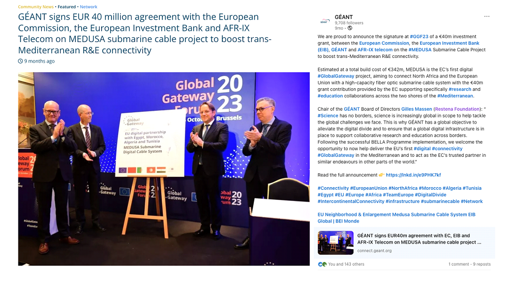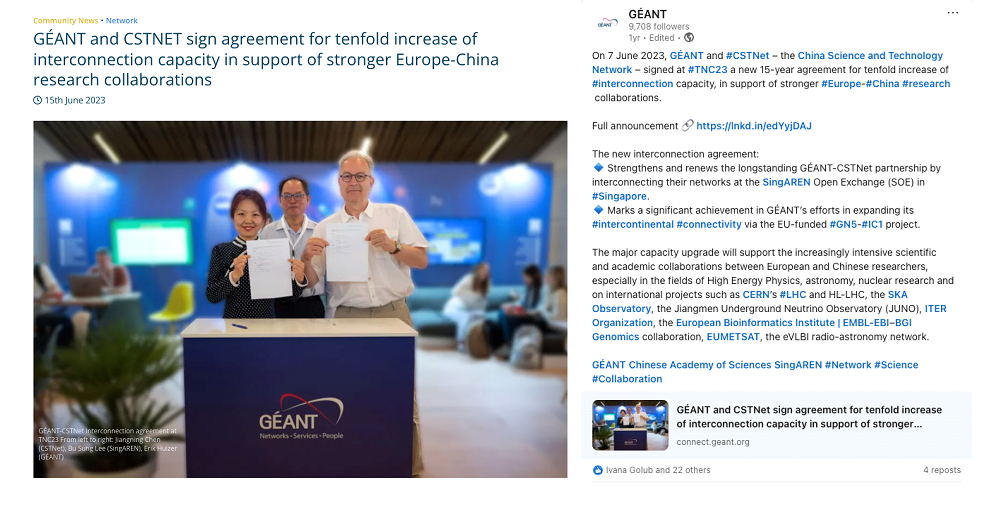 • A 15-year interconnection agreement was signed between GÉANT and the China Science and Technology Network (CSTNET). The agreement, which was signed during a ceremony held at TNC23, marks a significant achievement in GÉANT’s efforts to expand its intercontinental connectivity via the GN5-IC1 project.