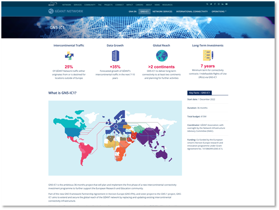 Building on the continuing support and commitment of the EC for nearly 30 years, and under the 72-month GN5 Framework Partnership Agreement in Horizon Europe (GN5-FPA), the GN5-IC1 project will plan and implement a new intercontinental connectivity investment programme to further support the European Research and Education community and extend and secure the global reach of the GÉANT network by replacing and updating existing intercontinental connectivity infrastructure.