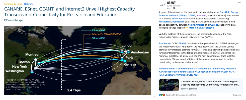 • Extensive market engagement activities for connectivity to North America took place in preparation for the launch of the tender for North Atlantic connectivity. Additionally, collaborative planning took place with the US partner ESnet to maximise the potential of investments and ensure these are synergetic and technically optimised.