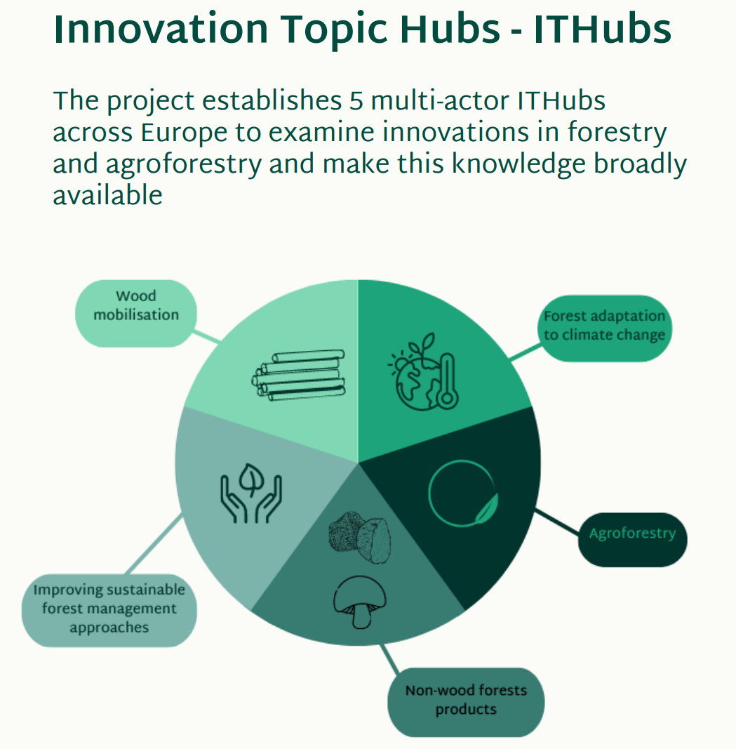Innovation Topic Hubs (ITHubs): Five cross-country hubs focusing on wood mobilization, climate adaptation, sustainable management, non-wood products, and agroforestry.