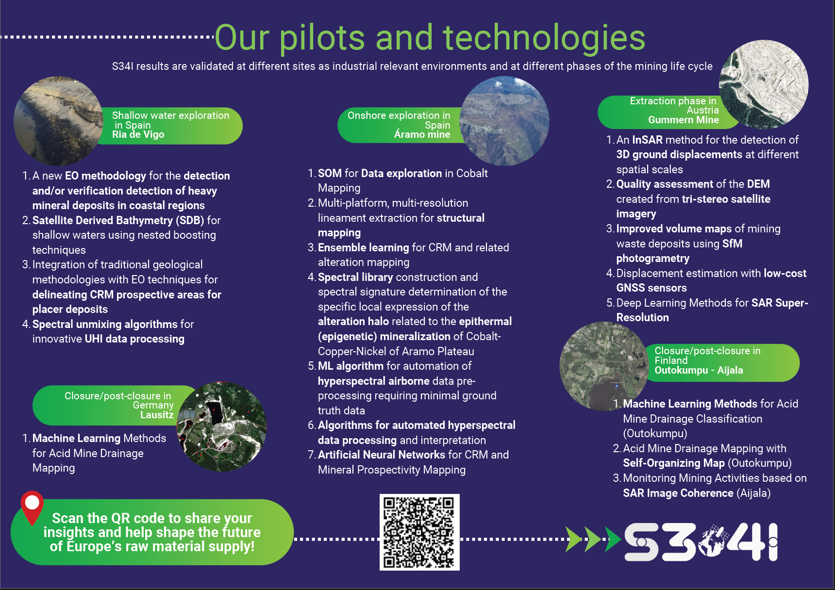 To ensure the further uptake and success of the S34I innovations, several key needs can be addressed. Continued research and demonstration are required to validate AI-driven methods, expand spectral libraries, and test the methods across diverse environments. Access to markets and dedicated financing will be essential for scaling from prototypes to operational services, supported by clear strategies for commercialisation and IPR management. In parallel, establishing regulatory and standardisation frameworks for EO and hyperspectral data will enhance interoperability and ensure ethical, transparent use. Strengthening international collaborations and aligning with global raw materials strategies will foster broader adoption, while targeted training and awareness-raising will equip industry, authorities, and society to fully benefit from these technologies.