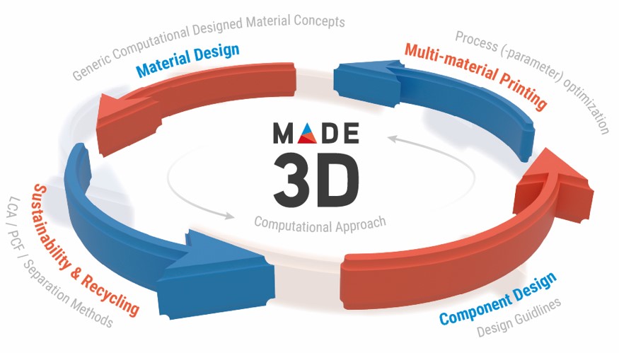 A strong focus on sustainability has driven the development of innovative recycling strategies for both bulk and powder materials, including methods for reusing powder waste and end-of-life components, significantly improving the environmental impact of AM technologies. To ensure further innovation, MADE-3D integrates computational material engineering by combining thermodynamics, microstructure predictions, and process simulations with machine learning. This approach accelerates development cycles, improves predictability, and enhances control over AM processes.
