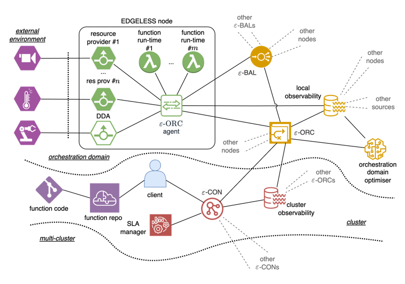 • The refined definition and implementation of the EDGELESS services, the reference implementation of a baseline orchestrator (ε-ORC), which realizes the key interactions with the other layers: ε-CON at a cluster level and nodes within its orchestration domain.